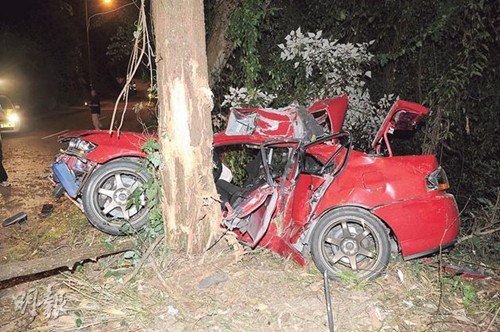 猛烈撞擊下車身呈形扭曲夾緊樹干。圖自香港..